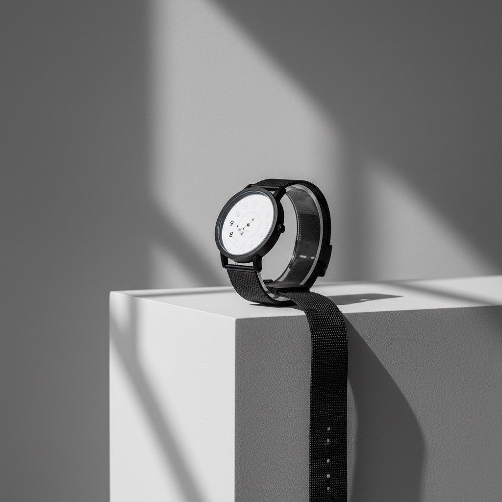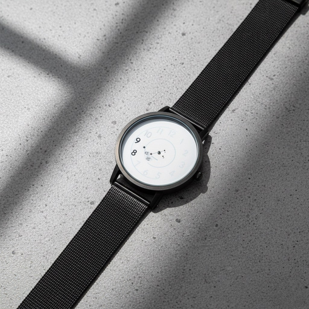 The TOMI Spiral features a rotating spiral dial where hours and minutes move beneath a fixed marker, creating a visually striking and unconventional way to read time. Its high-contrast black-and-white design emphasizes minimalist sophistication. The black-plated case paired with a Milanese mesh bracelet offers sleek elegance and a fluid, modern texture. With an ultra-slim profile powered by quartz movement, the watch blends avant-garde artistry with wearable everyday style.