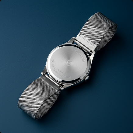 The Sinobi Lucid features a conceptual dial where time is read through rotating blue rings instead of traditional hands, creating a sleek, abstract display. Its high-tech, ultra-minimalist design combines silver, blue, and black for a bold modern aesthetic. The streamlined silver-toned case and sharply defined lugs provide a clean, architectural frame for the dynamic dial. Completing the look, a silver Milanese mesh bracelet adds comfort and contemporary elegance to this statement timepiece.