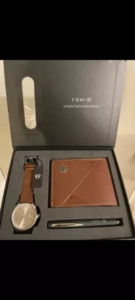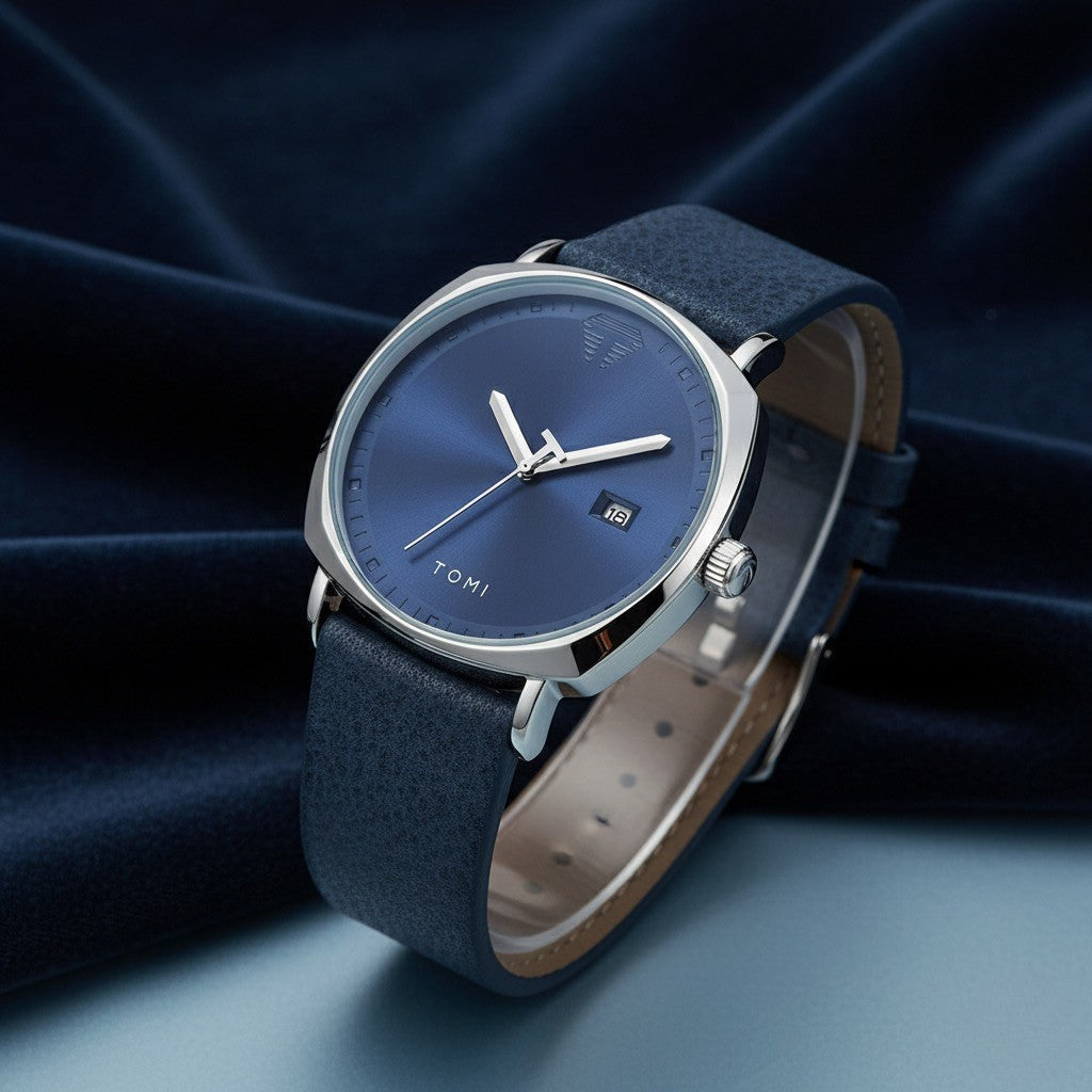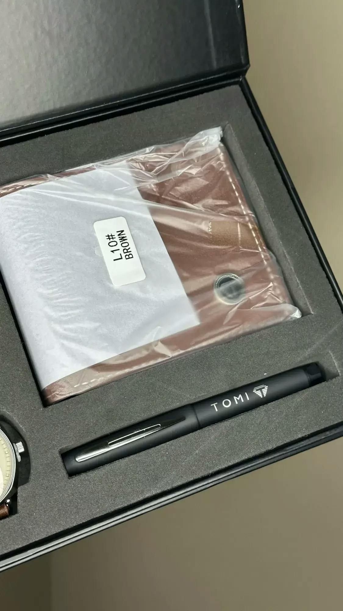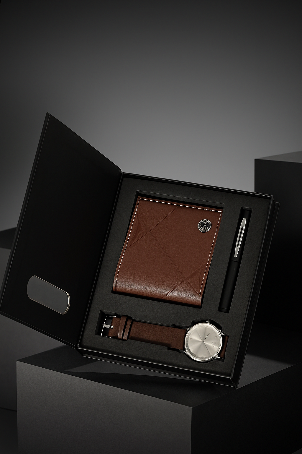 The Tomi Meridian is a minimalist dress-casual watch featuring a sleek dial and a rich leather strap that blends elegance with everyday versatility. Designed as the centerpiece of a premium 3-piece gift set, it’s complemented by a matching embossed leather wallet and a refined dark pen. Housed in a luxurious black box with a custom foam insert, every detail reflects thoughtful craftsmanship. Perfect for professionals, the Tomi Meridian delivers a coordinated and polished look for any occasion.