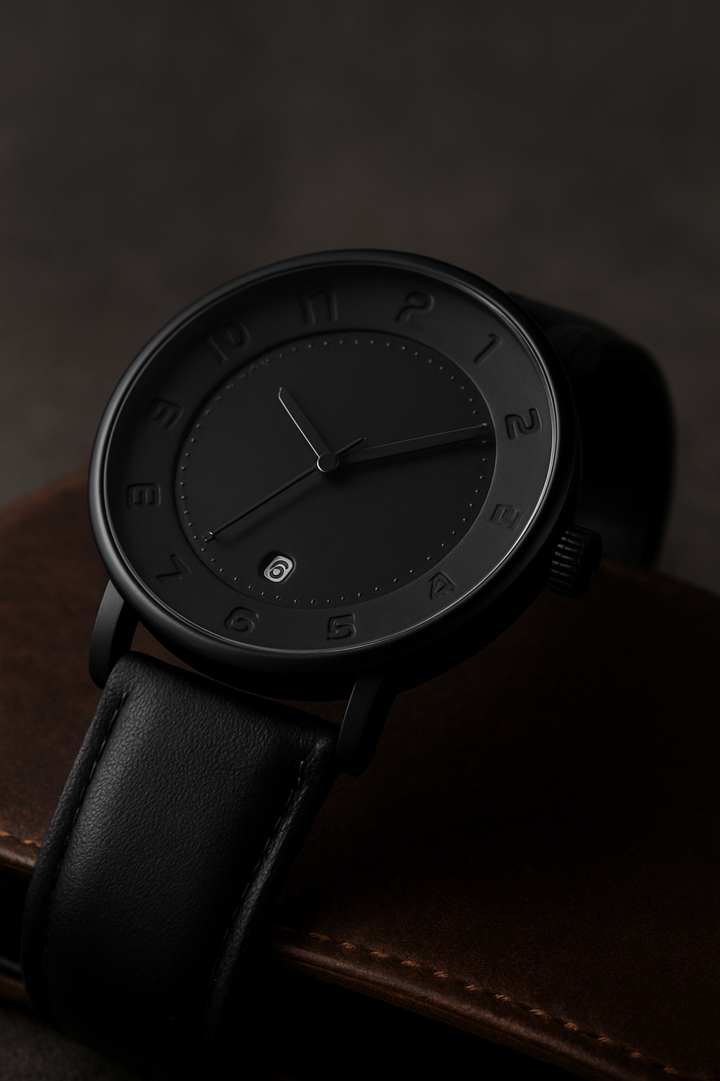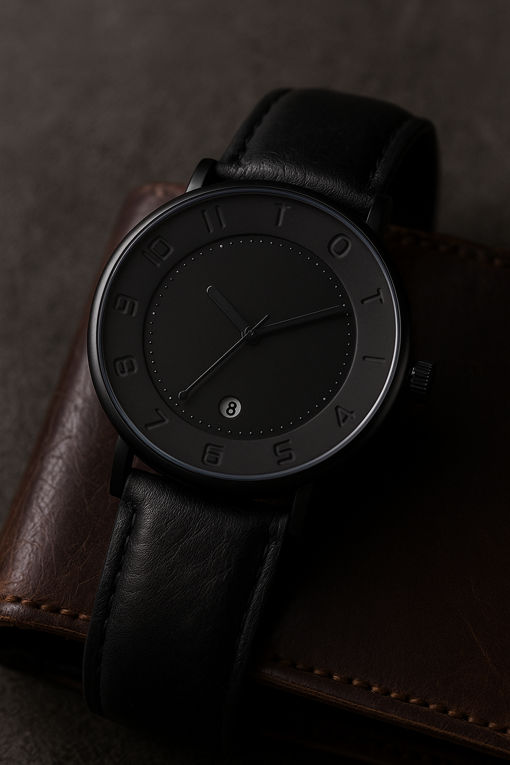 The Zero Hour timepiece showcases a sleek all-black “blackout” design with tonal engraved numerals that catch light and shadow for subtle depth. A recessed dial center and slim stick hands emphasize its minimalist aesthetic, while the 6 o’clock date window adds clean functionality. Paired with a seamlessly integrated black leather strap, it offers a refined, modern look with sculptural appeal.