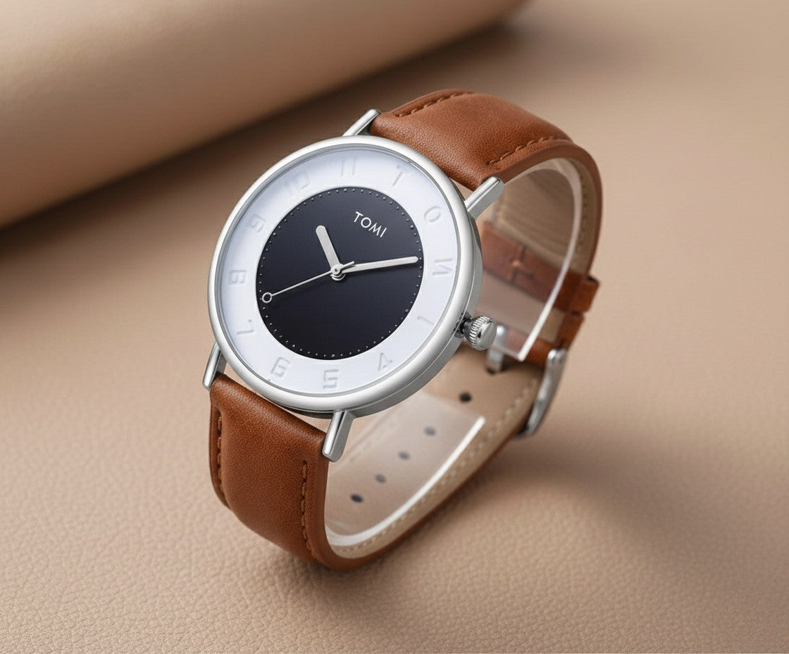 TOMI Timepiece Quartz: 40mm round quartz watch with alloy case, scratch-resistant glass, Arabic numeral dial, leather strap, and full calendar. Comes in a gift box—ideal for both casual and formal wear.